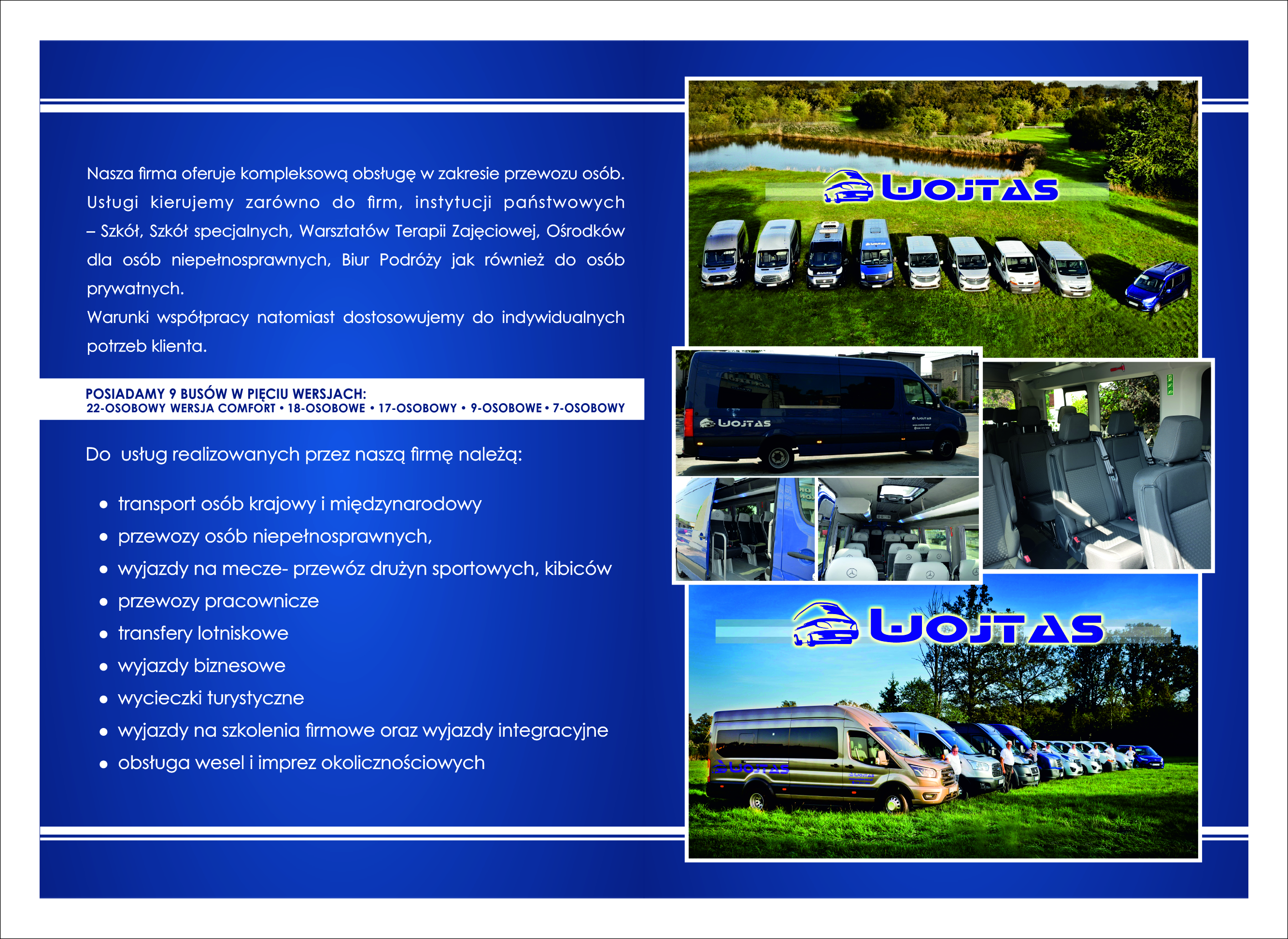 Nasza firma oferuje kompleksową obsługę w zakresie przewozu osób. Usługi kierujemy zarówno do firm, instytucji państwowych – Szkół, Szkół specjalnych, Warsztatów Terapii Zajęciowej, Ośrodków dla osób niepełnosprawnych, Biur Podróży jak również do osób prywatnych. Warunki współpracy natomiast dostosowujemy do indywidualnych potrzeb klienta.